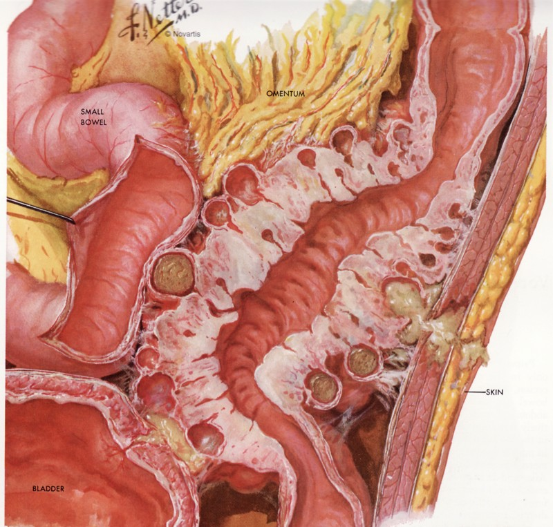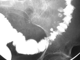 El colon es el sitio más común de formación de divertículos en el tubo digestivo. Cuando los divertículos no están inflamados, el proceso se conoce por diverticulosis; cuando se añade inflamación, se usa entonces el término diverticulitis. Estas “herniaciones mucosas” se desarrollan en los puntos débiles de la pared del colon bajo el influjo de la presión intraluminal aumentada. El estreñimiento ha sido citado con frecuencia como un factor importante que aumenta la presión intracolónica. Cuando no existe inflamación de algún divertículo, muchas veces los pacientes se encuentran asintomáticos, o presentan síntomas vagos como dolor mal definido en la parte central del abdomen o en el cuadrante inferior izquierdo, distensión flatulenta y ligera alteración del hábito intestinal. Y una radiografía con medio de contraste puede mostrar la enfermedad.